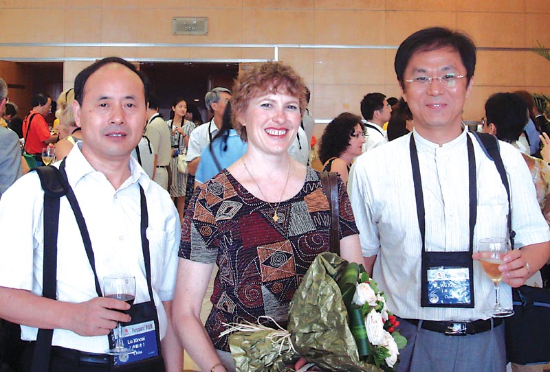 圖為無錫市翻譯協(xié)會副會長盧新才、秘書長吳興與新選國際譯聯(lián)主席瑪里安·博爾斯合影