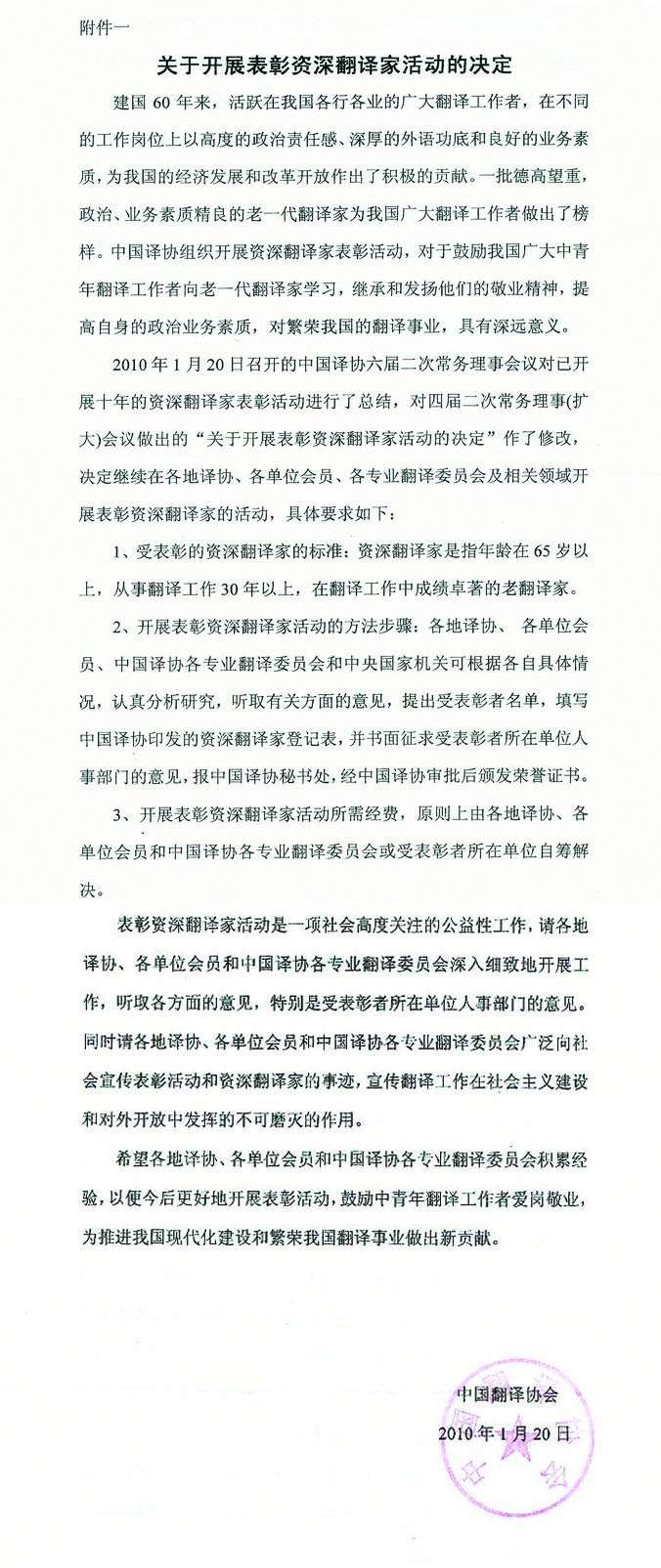 附件一:“關(guān)于開展表彰資深翻譯家活動的決定”