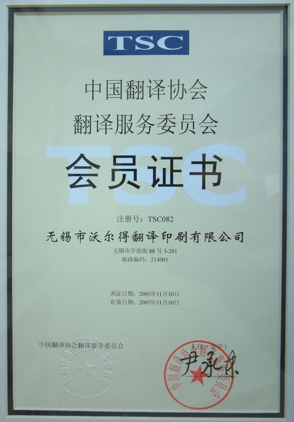 中國(guó)翻譯協(xié)會(huì)翻譯服務(wù)委員會(huì)會(huì)員證書(shū)